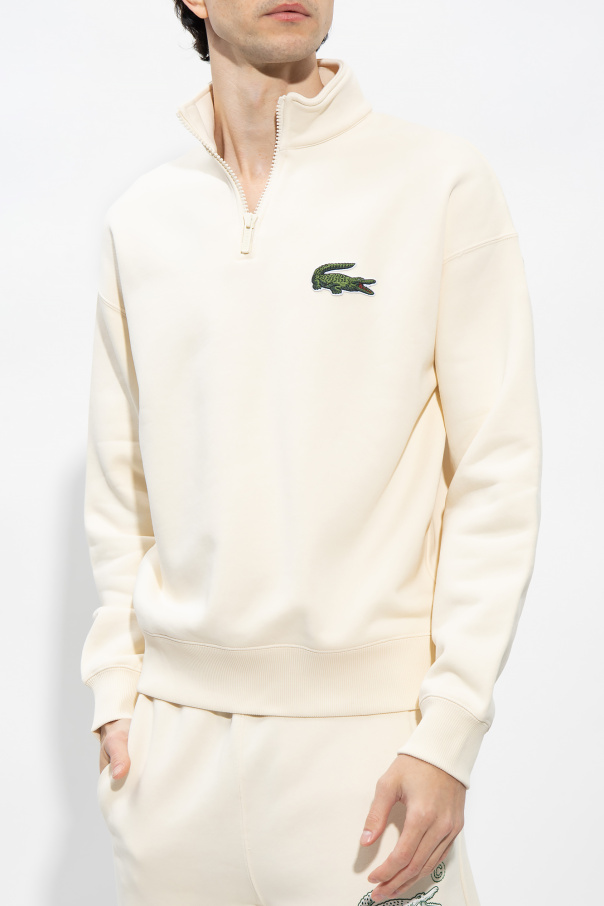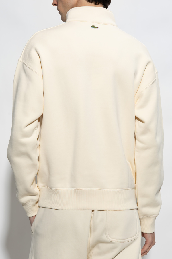 Cream sweatshirt with a standing collar from Lacoste. Crafted from organic cotton with a relaxed fit, this style features a zip fastening, green logo patches on the front and back, long sleeves and ribbing on the bottom hem and cuffs.
