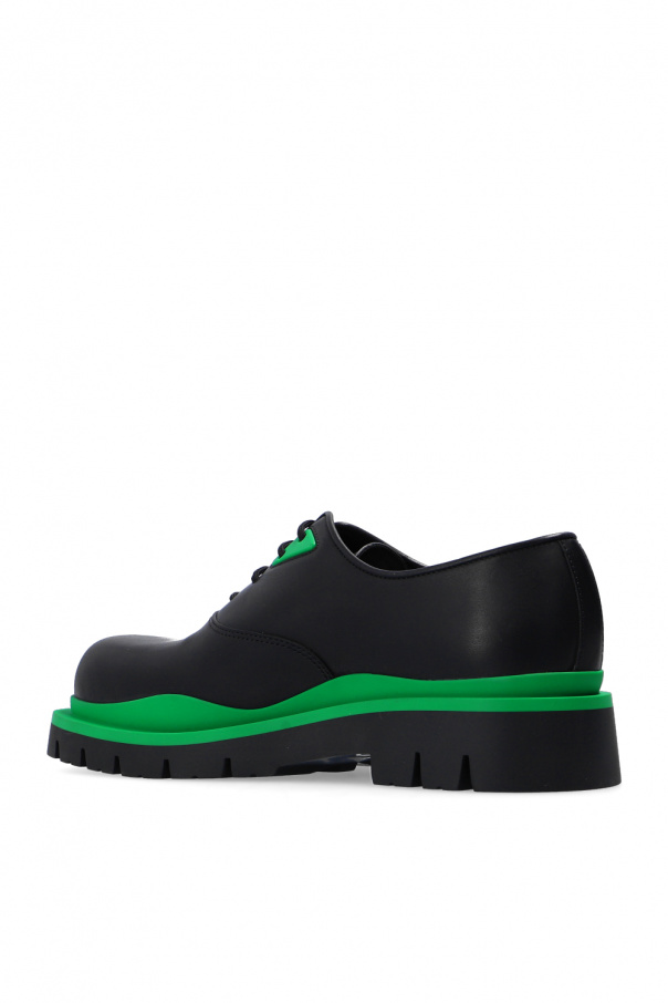 Black and green ‘Tire’ shoes from Bottega Veneta. Made from calf leather, this lace-up pair rests on a black and green rubber sole.