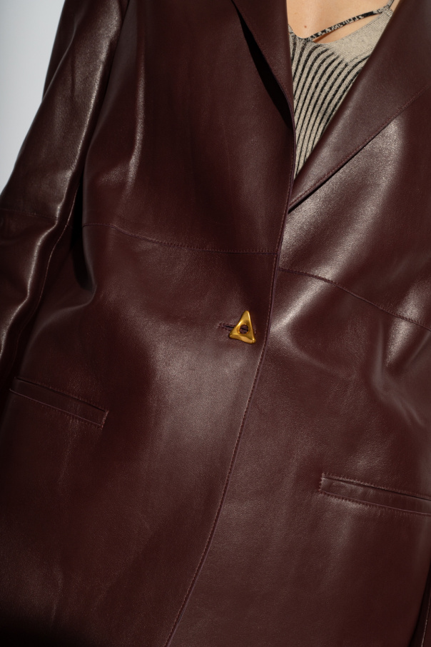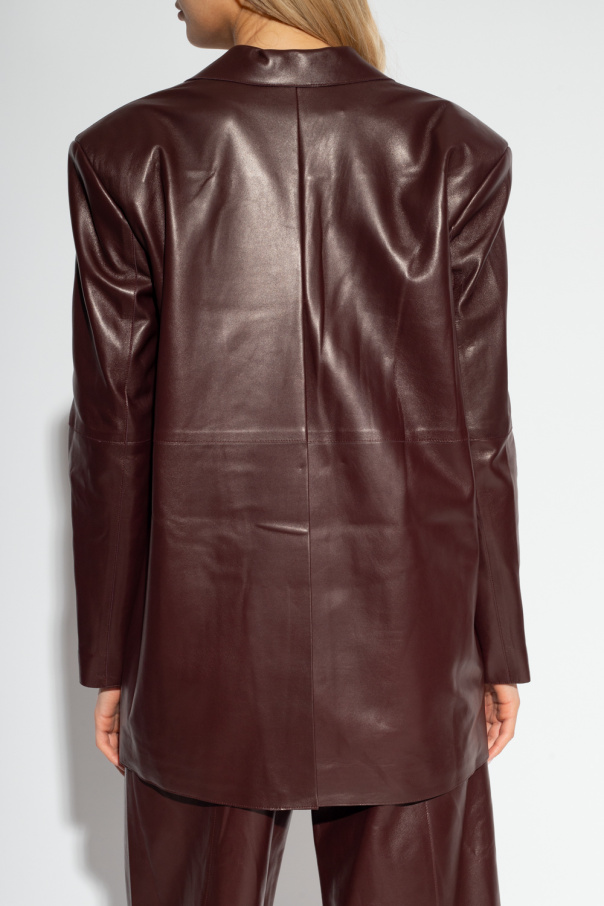 Dark brown ‘Mercedes’ blazer from Aeron. Crafted from lamb leather, this style features a single gold-tone button closure, notch lapels, two slip pockets, long sleeves and a single back vent.