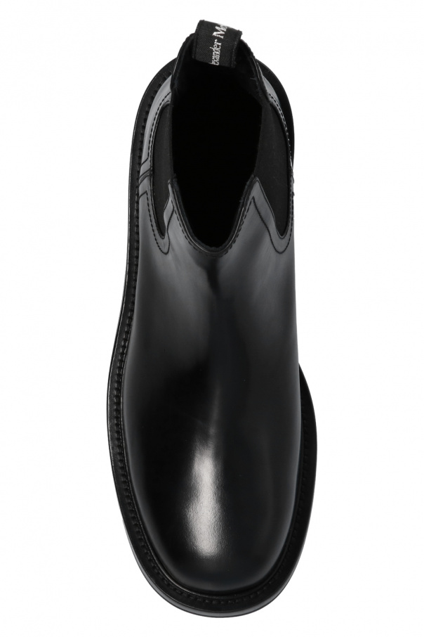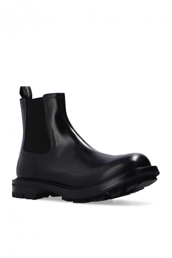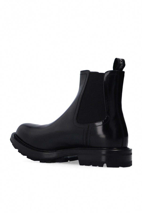 Black sneakers from Alexander McQueen. Crafted from leather with a slip-on silhouette, this model features an embroidered white logo, an almond-shaped toe and a black rubber sole.
