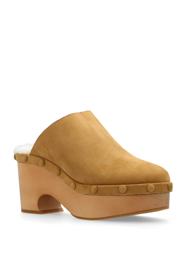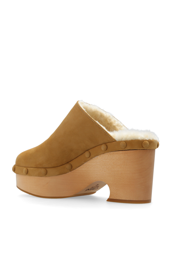 Beige platform clogs from Chloe. Crafted from suede, this pair sits on a beige sole made of wood and rubber. The design showcases suede detailing and an almond toe.