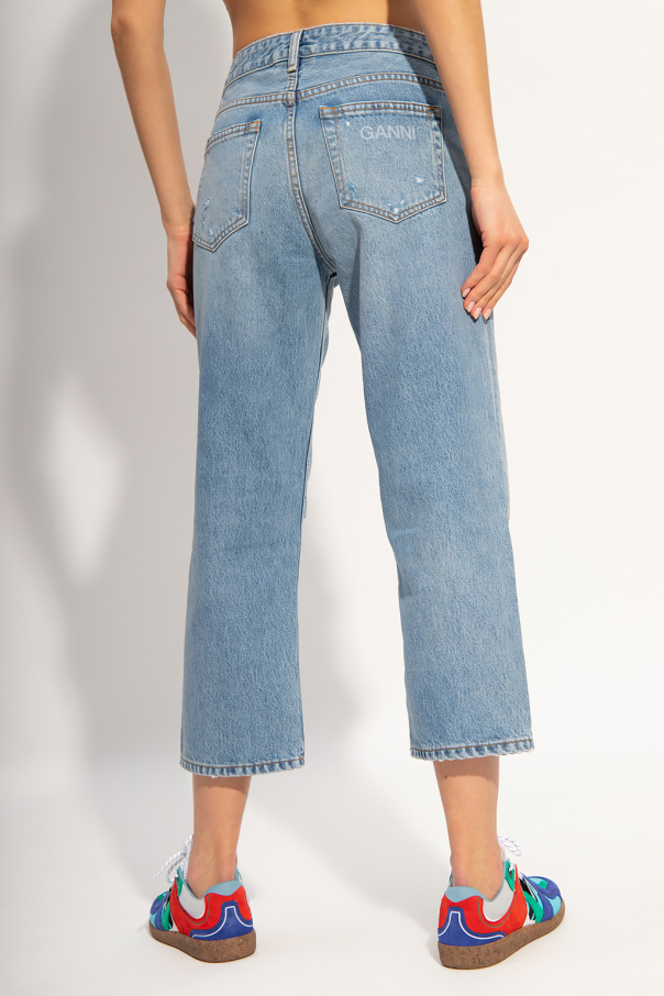 Blue jeans from Ganni. Crafted from organic cotton with distressed effects, this pair falls down with slightly tapered legs and features button fastenings, five pockets and a white logo print at the back.