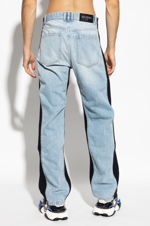 Introducing the Vintage Effect Jeans from the esteemed house of Balmain. These exclusive men\'s jeans are crafted from premium 100% cotton denim, offering an unwavering commitment to quality with no stretch. Their blue hue with a distinctive washed finish exudes an authentic \'vintage\' aura. The regular fit ensures a timeless silhouette, complemented by stylish distressing and subtle rips that add a touch of rugged charm. Modern accents are provided by striking black inserts along the sides of the legs, infusing a contemporary twist into this classic design. The traditional pocket arrangement includes two front pockets and two back pockets, while the back waistband features a designer logo patch, underscoring the exclusive nature of this piece. The jeans secure with a sturdy zipper and a metal button at the waistband, ensuring both style and functionality. These jeans seamlessly blend classic, timeless style with modern elements, making them a standout addition to any discerning wardrobe. Why Buy This Product? Authentic \'vintage\' effect with a unique washed finish. Crafted from 100% premium cotton denim. Timeless regular fit for a classic silhouette. Stylish distressing and subtle rips for a rugged charm. Contemporary black side inserts for a modern twist. Designer logo patch on the back waistband for an exclusive touch. Secure zipper closure with a metal button.