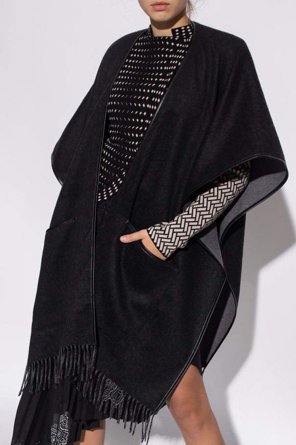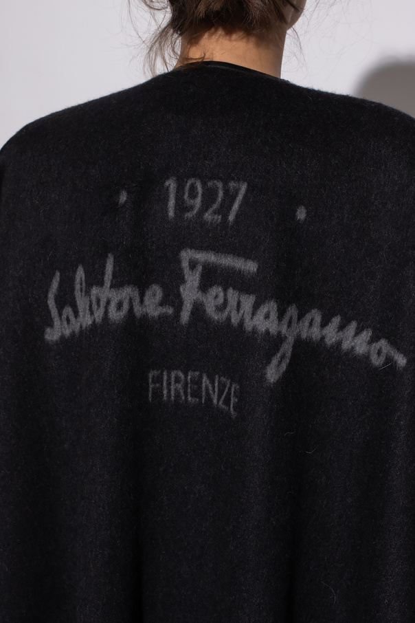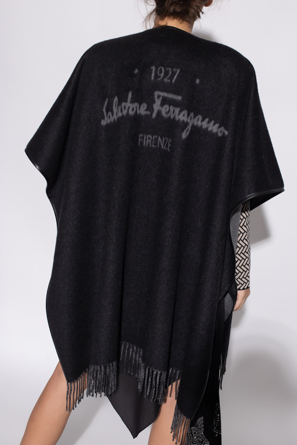 Black and grey poncho from FERRAGAMO. Crafted from cashmere, this garment features a logo pattern, two slip pockets and fringes.