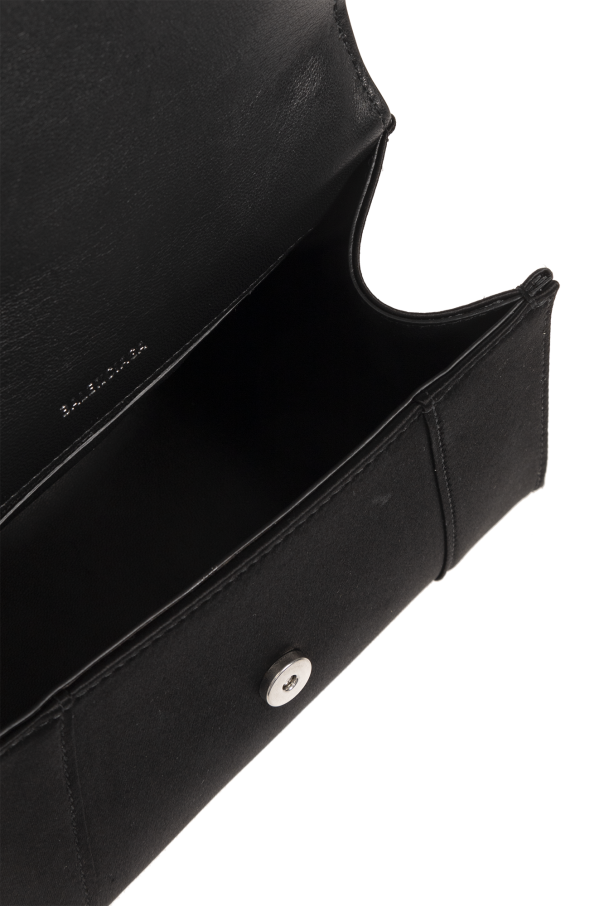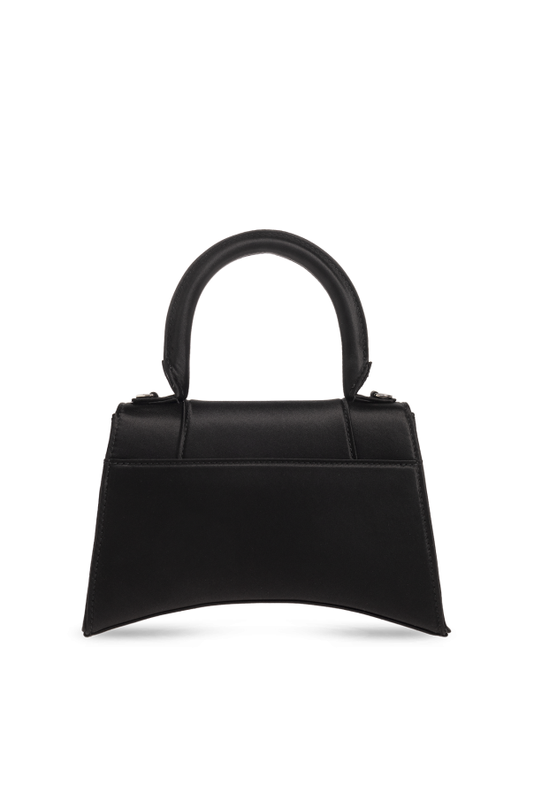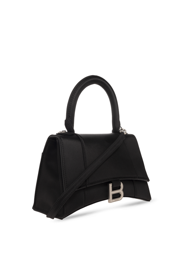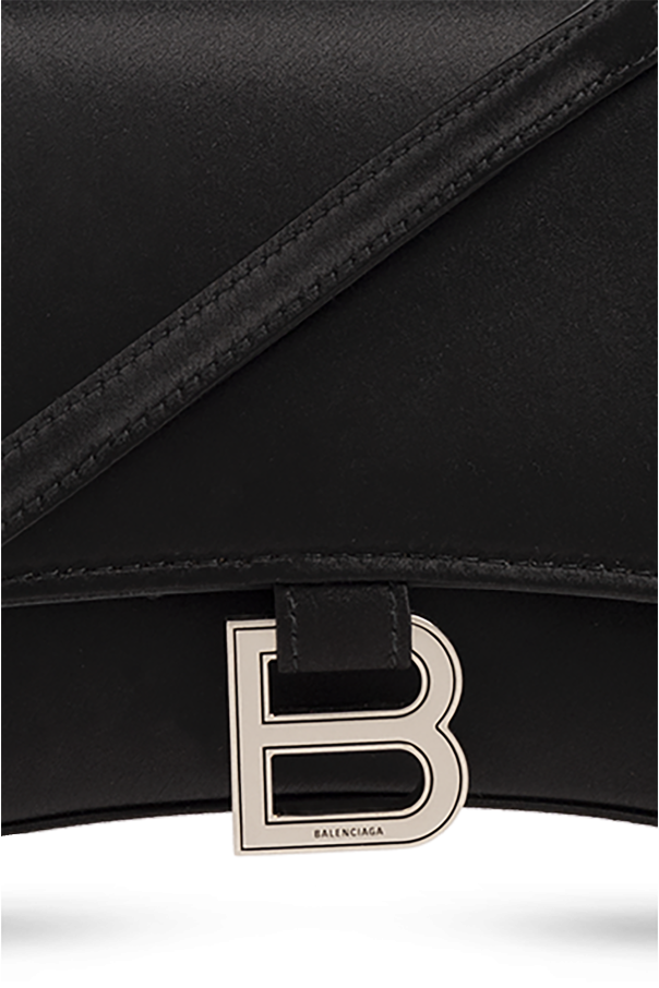 Black ‘Hourglass Small’ shoulder bag with a satin finish from Balenciaga. Fastened with a snap, this design features metal logo-engraved B detail, back pocket, half-round handle, detachable and adjustable shoulder strap, silver-tone metal hardware and one internal compartment with one zip pocket.