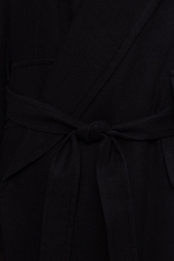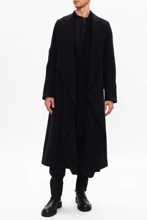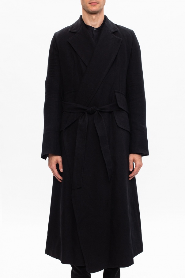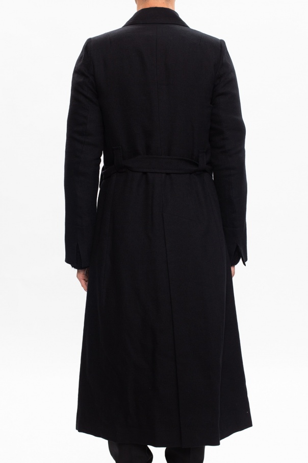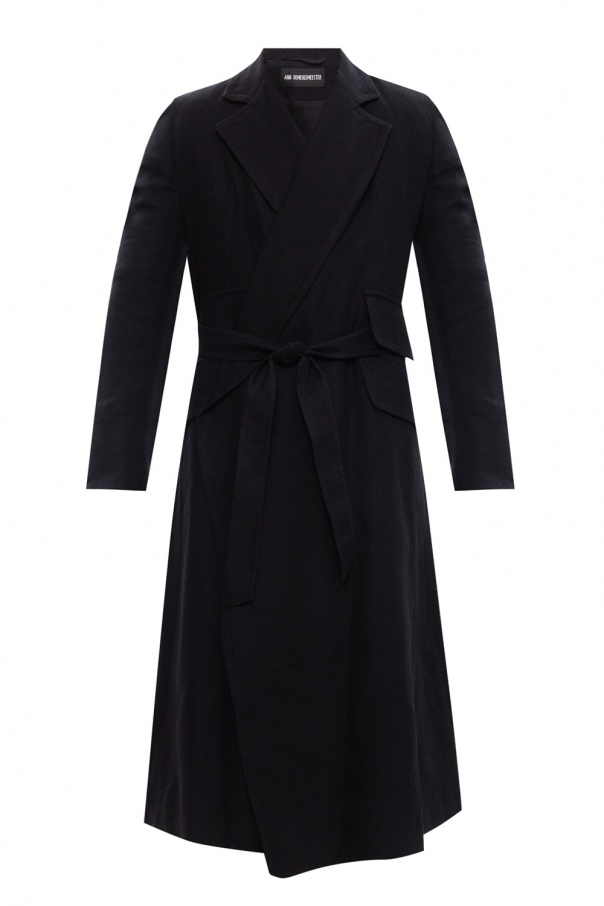 Black coat with notch lapels from Ann Demeulemeester. Trimmed with wool, this design is complete with four flap pockets, a slit at the back and a removable belt.