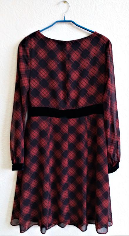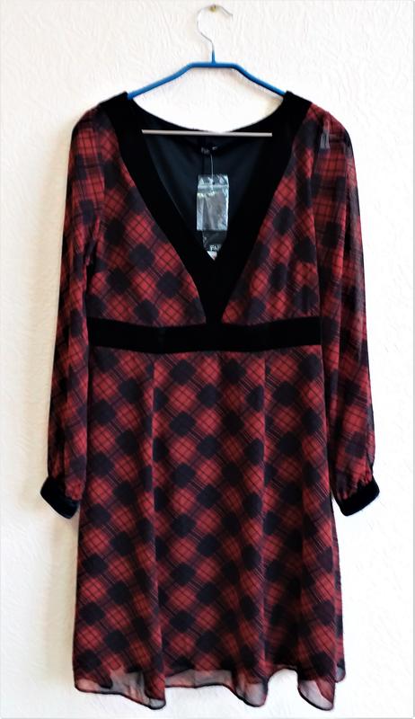 Платье от английского бренда F&F. По боковому шву застегивается на молнию. Верх: плотный шифон с бархатными вставками. Ткань не тянется. На рукавах манжеты с пуговкой. Есть подкладка. Ткань подкладки тянется.