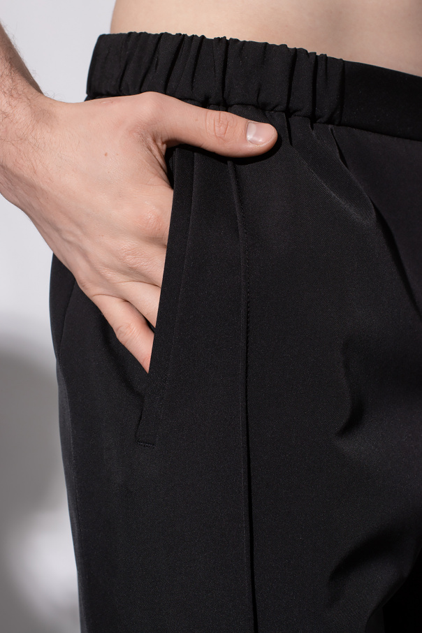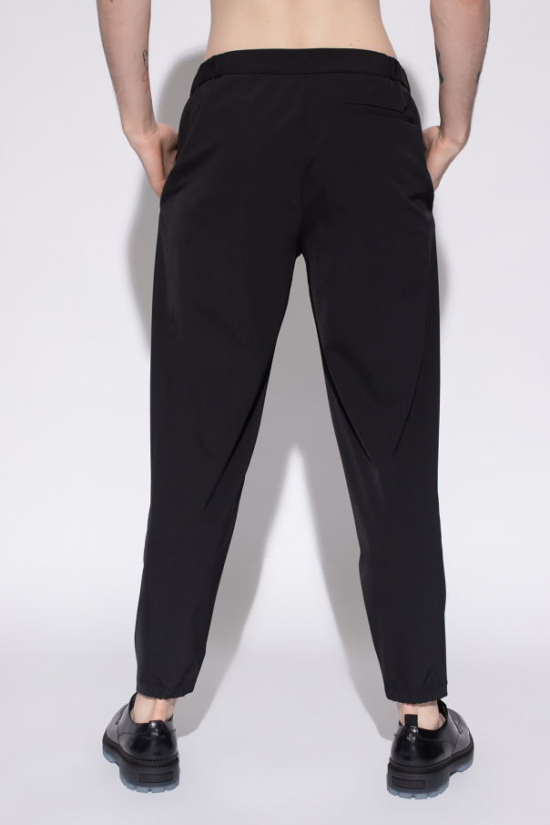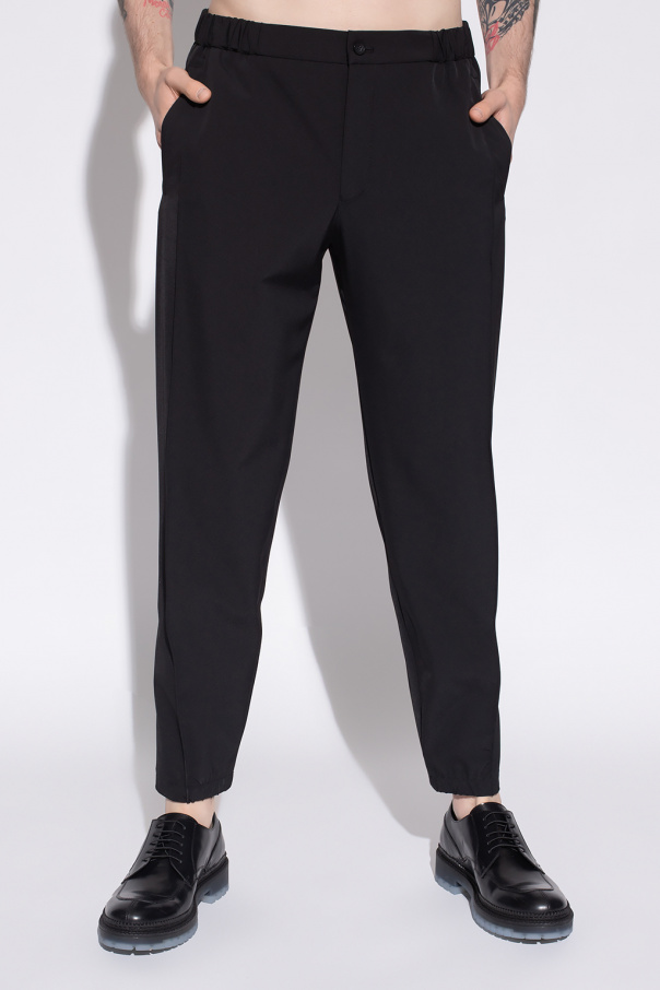 Black trousers from Emporio Armani. Fastened with a zip and button, this pair falls down with slightly tapered legs and features an elastic waistband with stitching details, two front pockets and one back pocket.