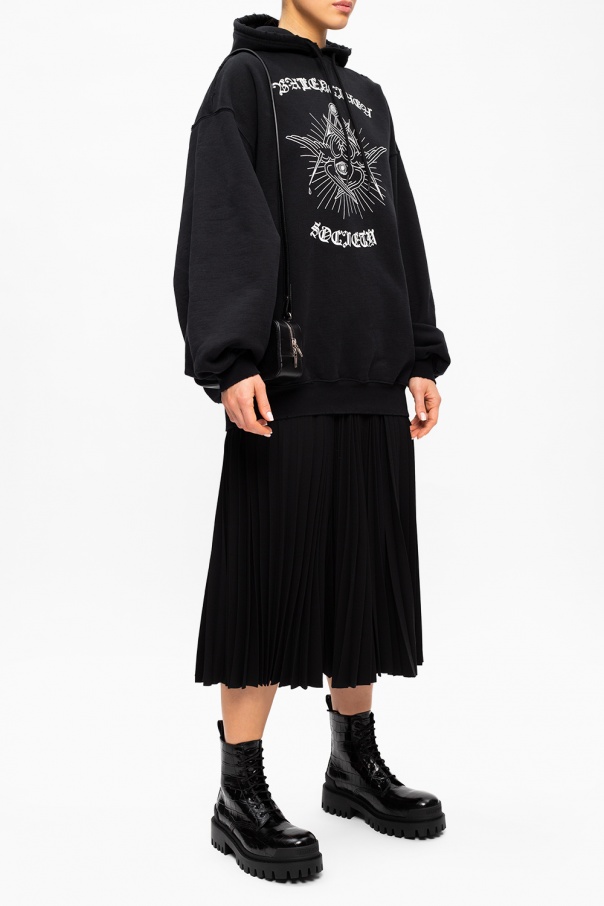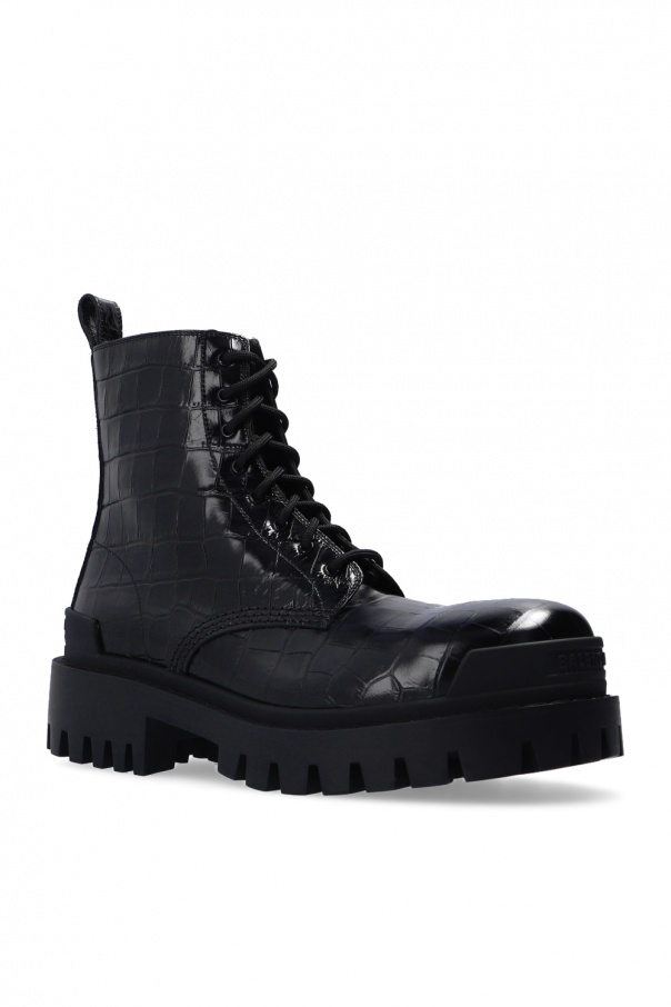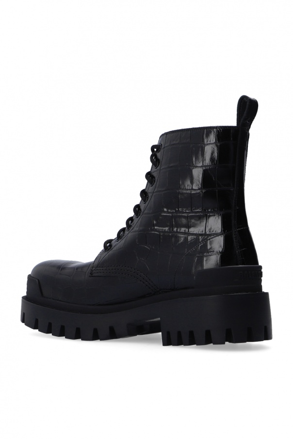 Black ‘Strike’ ankle boots from Balenciaga. Crafted from patent calf leather with a crocodile skin effect, this pair rests on a black rubber sole.