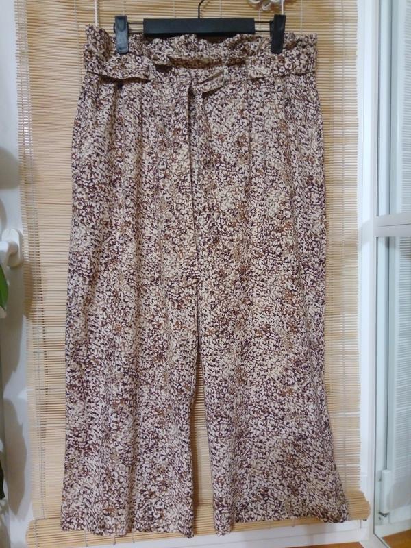 Бриджі присбирані на поясі, ззаду на резинці, висока посадка, 100% віскоза, напів пояс з бічних швів зав'язується спереду.