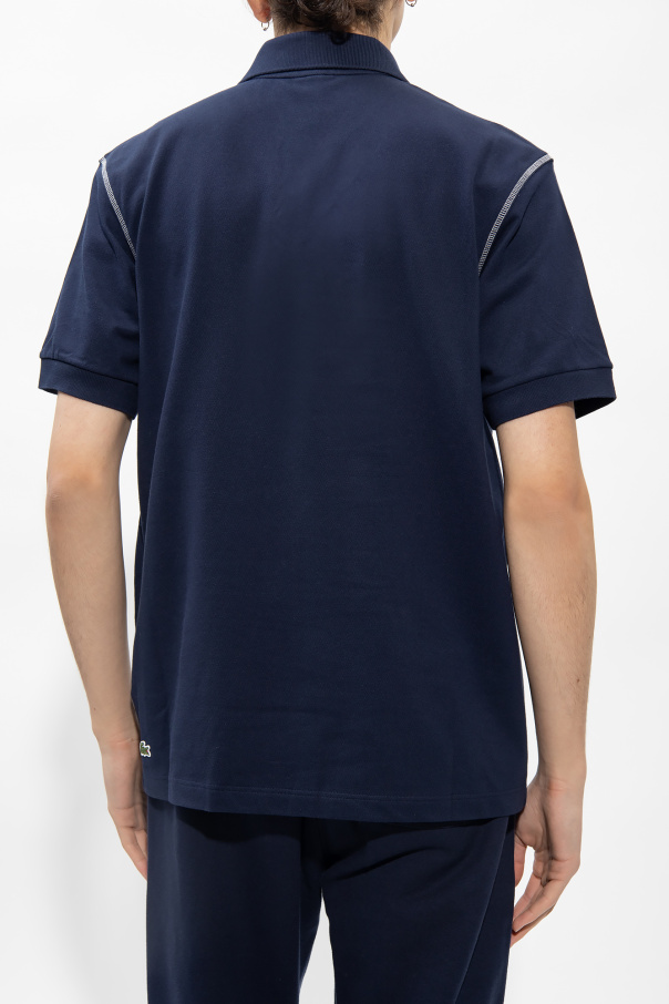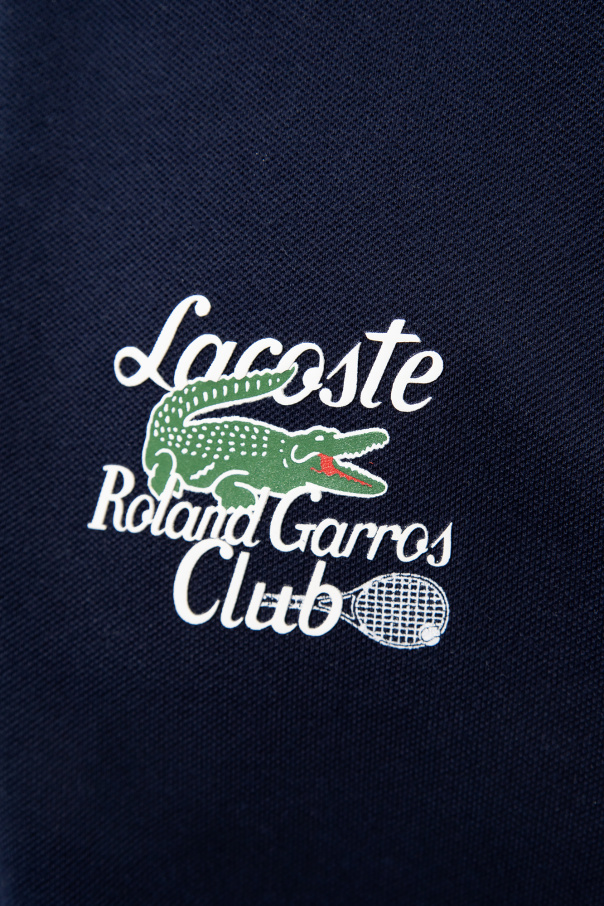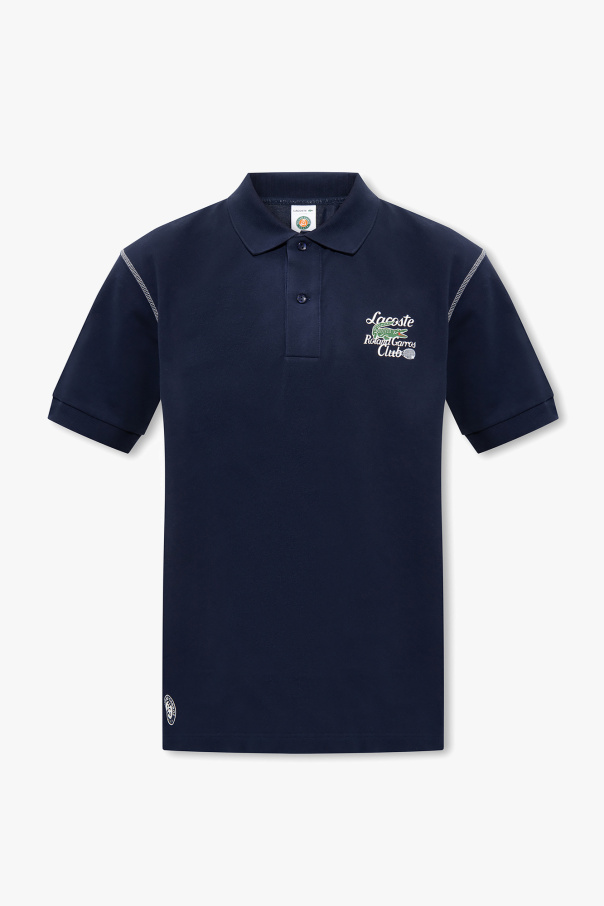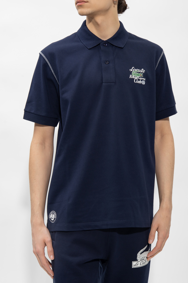 Navy polo shirt from Lacoste x Roland Garros. Made of organic cotton, this design features a green and white logo pattern and short sleeves with ribbed edges.