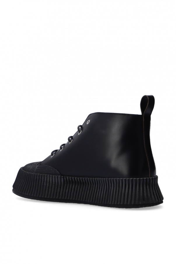 Black platform shoes from Jil Sander. Crafted from leather, this design features a pull tab, worn effect and black rubber sole.