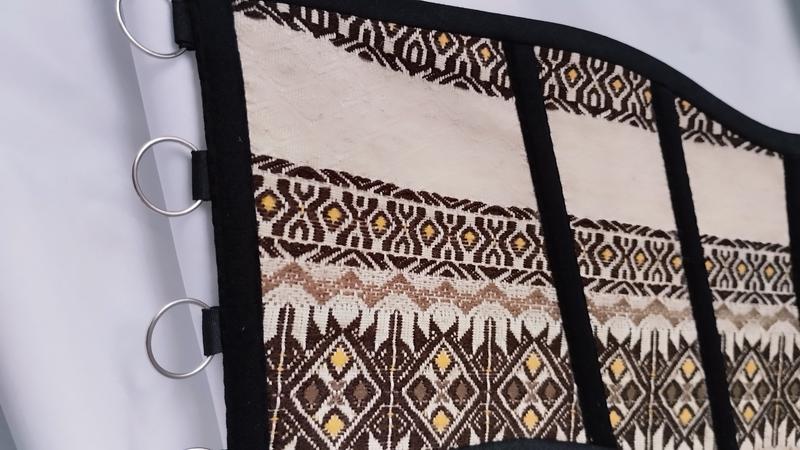 Маю невелику утяжку.Матеріал виготовлення : декоративна тканина з етнічним візерунком.