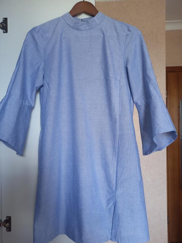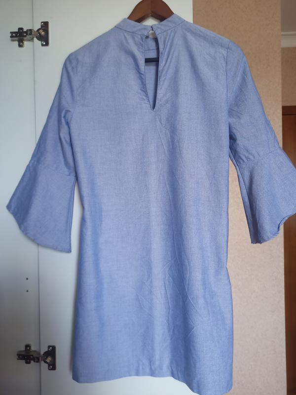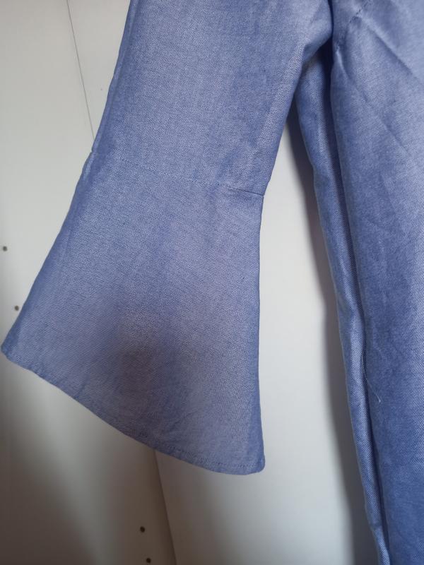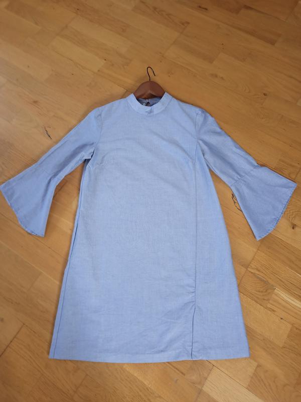 Размер S.В плечах -38, пог-45, рукав колокол 45, длина -86 см Спереди маленький разрез. По бокам внутренние кармашки. Котон.Состояние: ИдеальноеЦвет:- Голубой