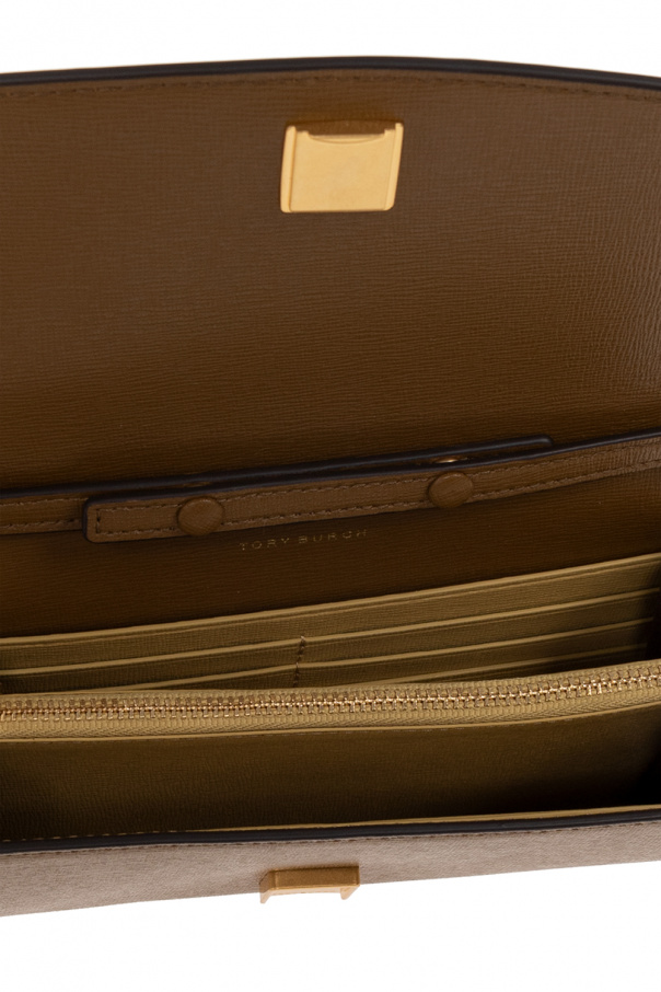 Greenish brown wallet with a shoulder strap from Tory Burch. Made of cow leather, this item features a magnetic closure, logo appliqué, gold-tone metal hardware and two internal compartments with twelve card slots, two slip pockets and one zip pocket.