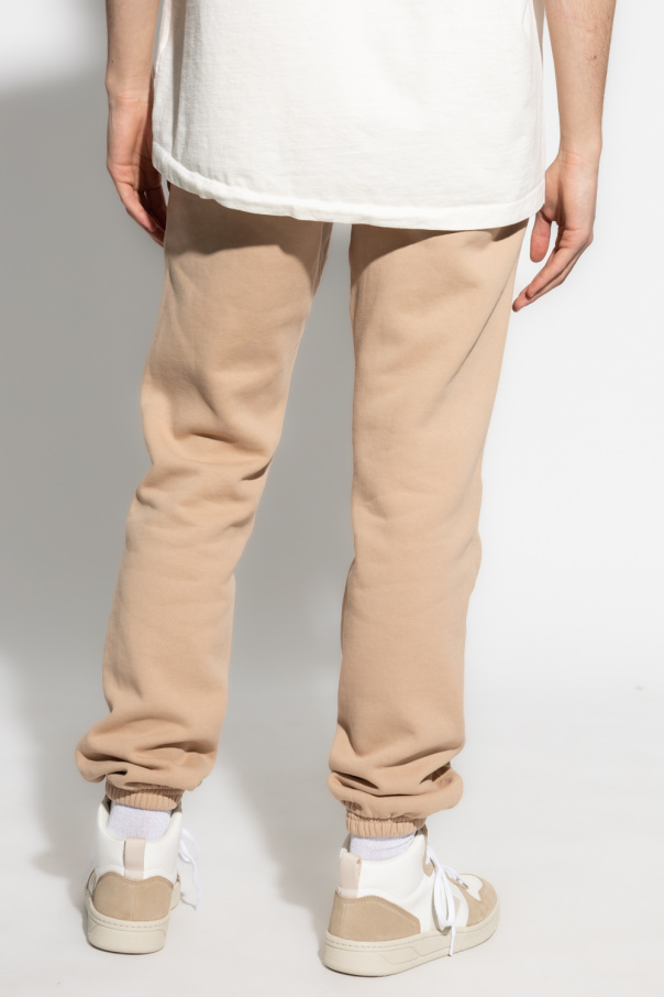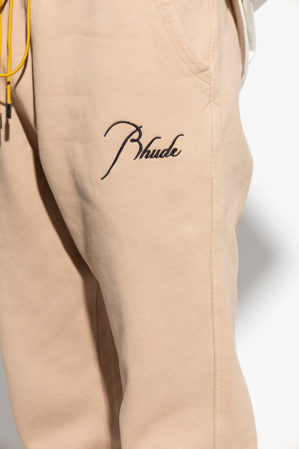 Brown trousers from Rhude. Made of cotton, this pair features an elastic drawstring waistband, embroidered logo pattern, four slip pockets and ribbed cuffs.
