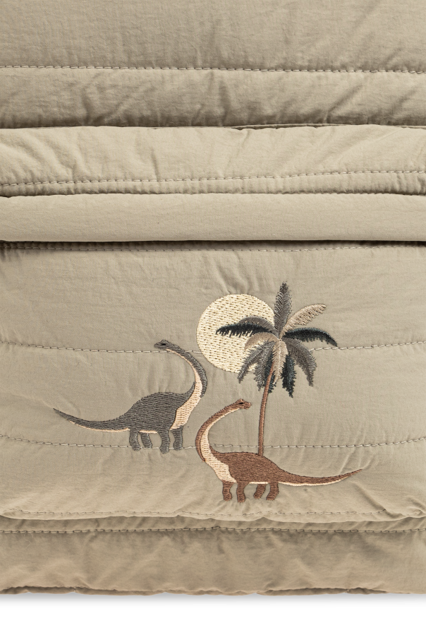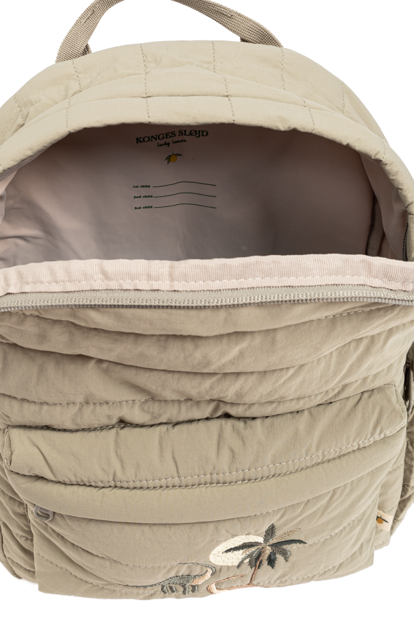 Product Description Discover the epitome of youthful elegance with the quilted children\'s backpack by Konges Sløjd. This exclusive backpack, dominated by a sophisticated beige hue, features a quilted texture that exudes both softness and an intriguing tactile appeal. Crafted with precision, the backpack boasts a classic rectangular shape with gently rounded edges, ideal for children. The exterior is adorned with an exquisite embroidered motif of two dinosaurs, a palm tree, and the sun, rendered in subtle, natural shades, adding a touch of charm. Functionality meets design with a spacious main compartment and a front pocket, both equipped with dual zippers. The main compartment includes a dedicated space for the owner\'s details, ensuring peace of mind for parents. Comfort is paramount with two adjustable, quilted shoulder straps and an additional top handle for versatile carrying options. The backpack also features a stabilizing cross strap to prevent slipping off small shoulders. Bearing the distinctive logo of Konges Sløjd, a brand known for its commitment to sustainable production and unparalleled craftsmanship, this backpack is made from 100% nylon exterior, 100% polyester lining, and 100% polyester filling. The material is both water and wind-resistant, ensuring durability for all adventures. Why Choose This Product? Elegant and timeless beige color Soft, quilted texture for added comfort Charming embroidery of dinosaurs, palm tree, and sun Spacious compartments with secure dual zippers Adjustable, quilted shoulder straps for comfort Stabilizing cross strap to prevent slipping Water and wind-resistant materials Designed by the renowned Konges Sløjd