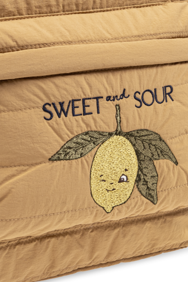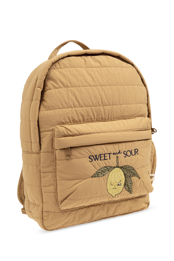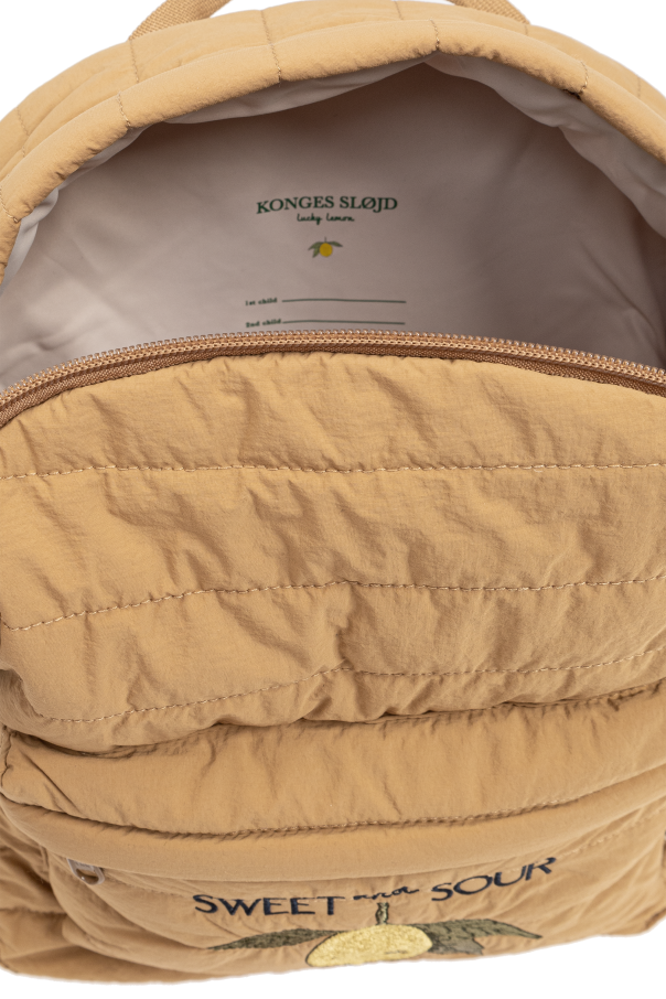 Introducing the Quilted Kids Backpack in an exquisite brown hue, a creation by the distinguished Danish brand Konges Sløjd. This backpack boasts a classic rectangular shape with gracefully rounded top corners, perfectly blending functionality with a touch of whimsical charm. Crafted from soft, quilted nylon, this elegant accessory features a delightful embroidered front pocket with the phrase \"SWEET and SOUR\" and an endearing lemon motif. The main compartment and front pocket are secured by dual zippers, ensuring the safety of your child\'s belongings. The backpack is designed with adjustable shoulder straps and a chest strap with a buckle, offering unparalleled comfort and stability. Inside, the polyester lining bears the \"Konges Sløjd\" logo and name, adding a refined touch. A side pocket accommodates a bottle, making hydration convenient on the go. Why choose this product? Exquisite quilted design with embroidered details Durable, water-resistant, and windproof nylon material Adjustable straps and chest buckle for enhanced comfort Convenient side pocket for bottles Elegant brand detailing inside Handy top handle for easy carrying