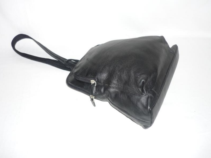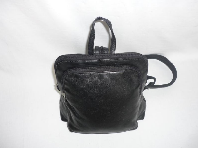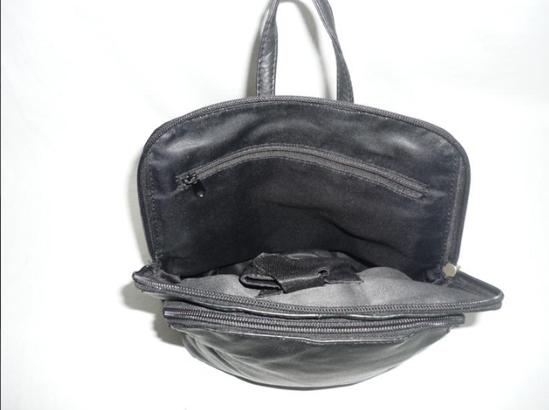 Практичный, прочный, вместительный, не большой рюкзак для города черного цвета. Материал - эластичная, натуральная кожа, подкладка - текстиль. Имеет ручку для переноса, лямки на молнии. Отделение на молнии с двумя карманами, один из которых на молнии. На передней стенке - большой накладной карман на молнии, с тыльной стороны - врезной карман на молнии. Стан - б/в, очень красивый, признаки пользования на коже не важны, дефектов отсутствуют. Габариты: высота - 28 см., длина по дну - 25 см. длина по верху - 19 см. глубина: дно - 7,5 см., карман - 3,5 см., длина лямки - 95 см, регулируется.