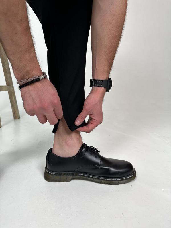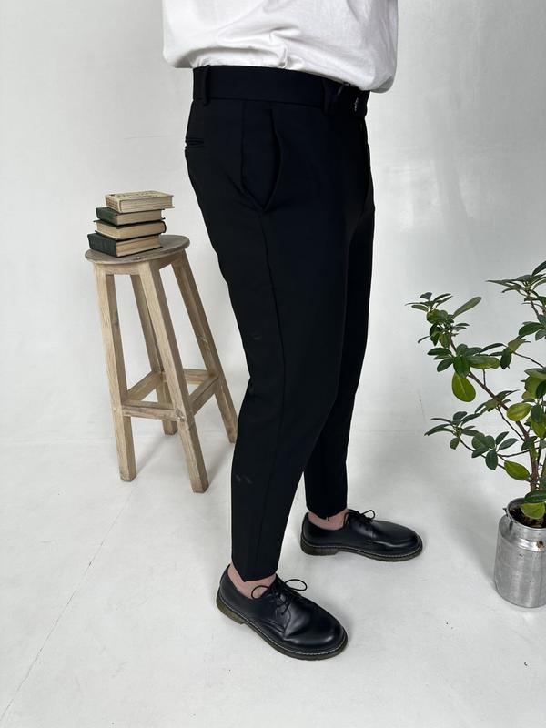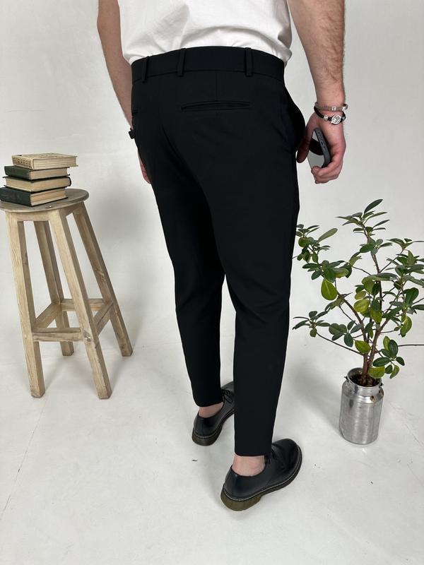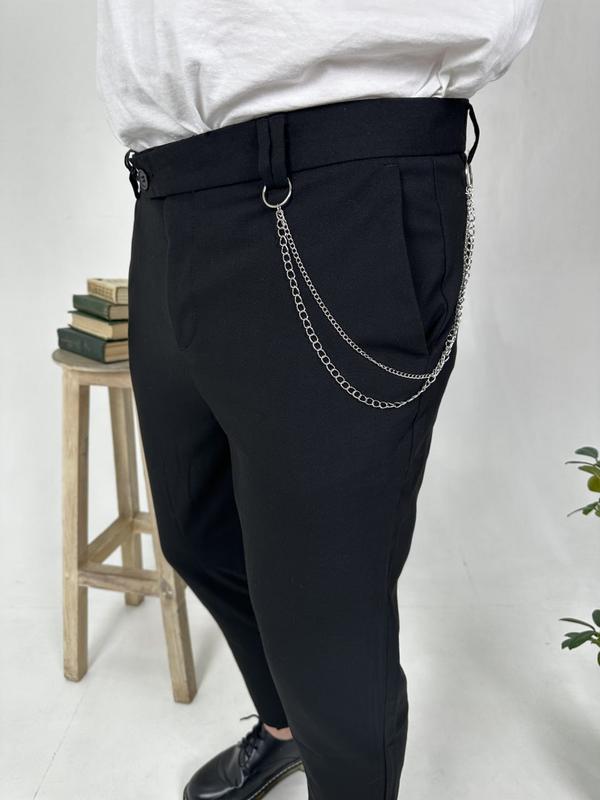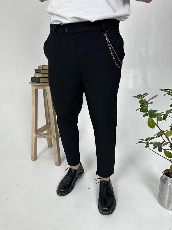 Черные брюки с молнией в низу для удобства. Завуженого фасону. Цепь идет в комплекте. 4 кармана. Сверху шлевка (петли) для пояса или ремня. Застежка на 1 пуговицу и молнии. Ткань на ощупь классическая, очень качественно и темно черного цвета, не тянется.Состояние: НовоеЦвет:- Чёрный