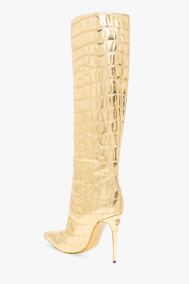 Gold-tone slip-on heeled boots from Dolce & Gabbana. Made of fabric with a gloss finish and crocodile skin effect, this pair is complete with a logo appliqué at the back, pointed toe and gold-tone sole.