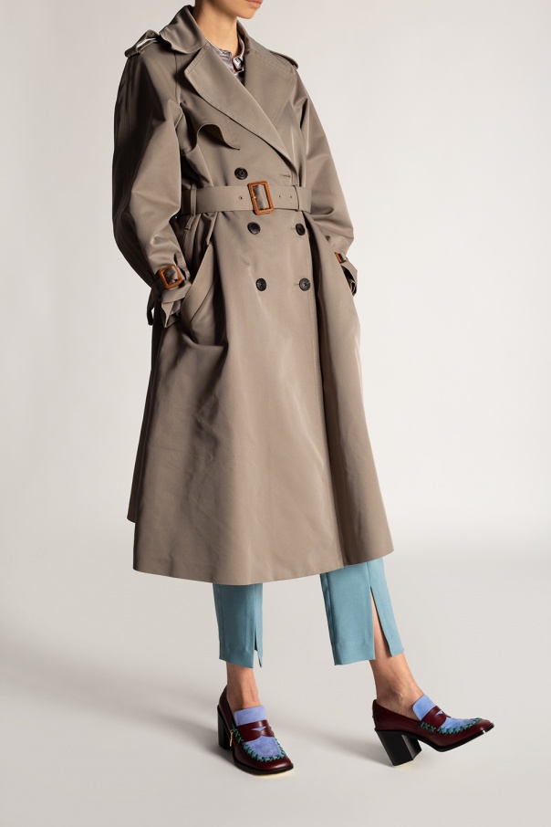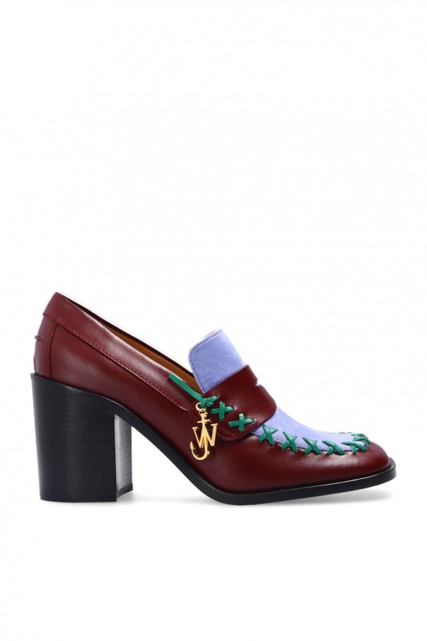 Maroon and light blue heeled pumps from J.W. Anderson. Crafted from leather, this design features a gold-tone logo charm, decorative green stitching details and a black leather sole.