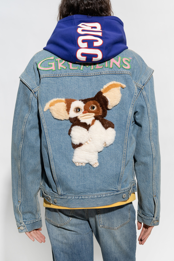 Blue denim jacket from Gucci x Gremlins™. Emblazoned at back with a colourful Gizmo & logo patch, this style features front button fastenings, two welt pockets, two flapped pockets with buttons and long sleeves with button cuffs.