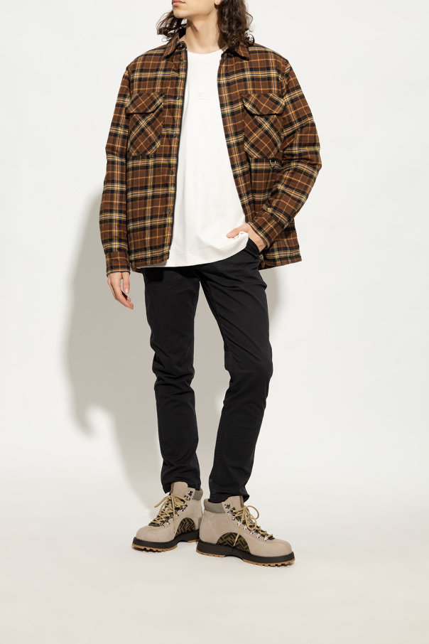 Greyish beige boots from Fendi. Made of nubuck, this lace-up pair features brown inserts embroidered with a black monogram and rubber sole in dark brown and beige.
