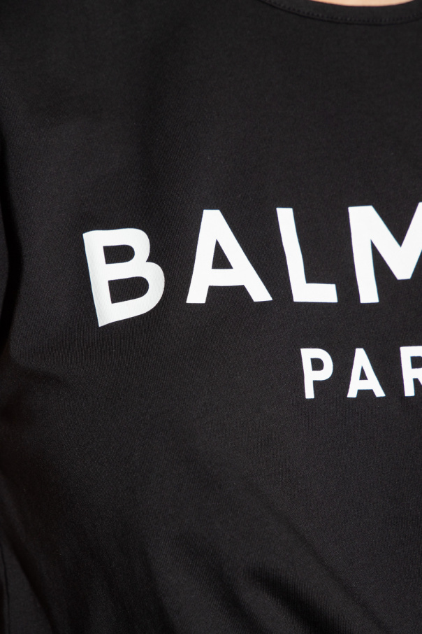 Black sleeveless T-shirt from Balmain. Made of cotton, this item features a round neck, decorative gold-tone buttons and a white graphic print with the brand\'s logo.