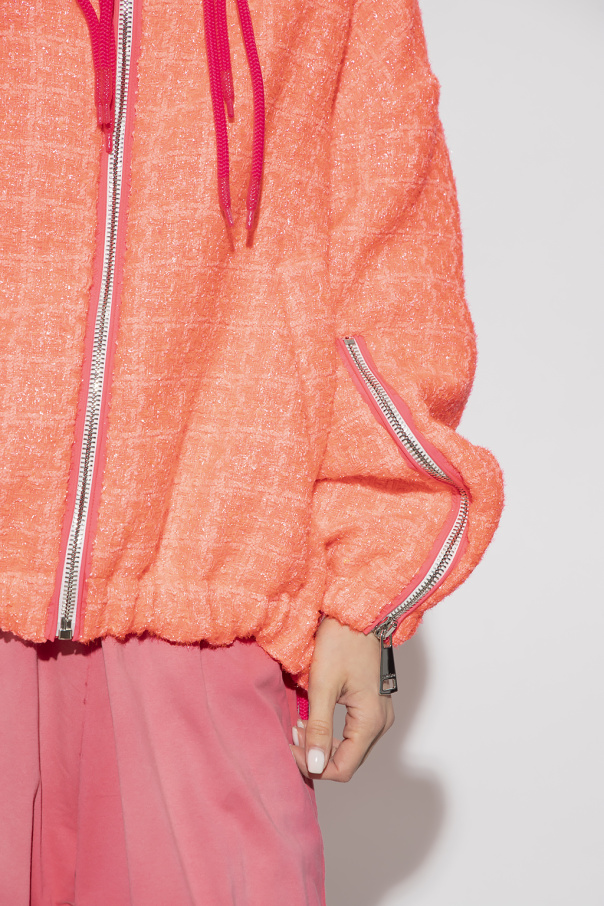 Neon pink loose-fitting jacket from KHRISJOY. Made of tweed, this garment features a zip fastening, lurex threads, drawstrings at the hood and hem, two front pockets, logo print at the back and long sleeves with zip details and ribbed cuffs.