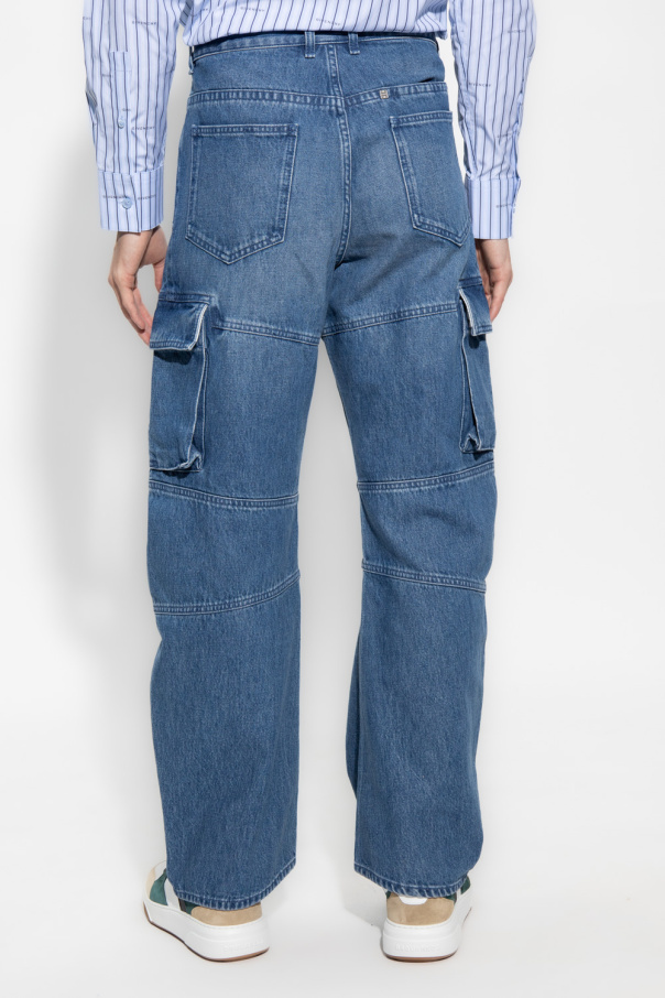 Blue cargo jeans from Givenchy. Equipped with multiple slip and flapped pockets, this pair falls with relaxed-fitting legs and features a zip fly with a button and hook and logo-shaped metal hardware on the front and back.