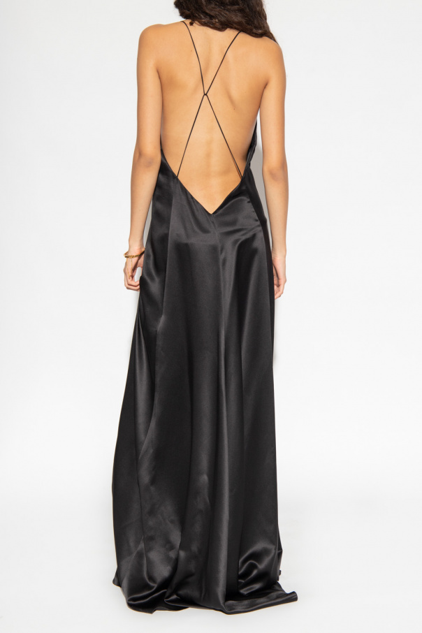 Black maxi slip dress from Saint Laurent. Made of silk, this style features a plunging V-neckline, a frontal slit and a denuded back.