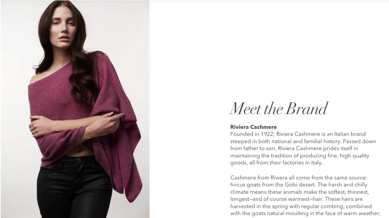 Італійський бренд Riviera Cashmere, заснований у 1922 році, має національну та сімейну історію. Передається від батька до сина, Riviera Cashmere пишається тим, що зберігає традицію виробництва вишуканих високоякісних товарів на своїх фабриках в Італії.