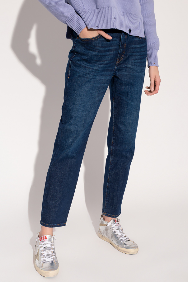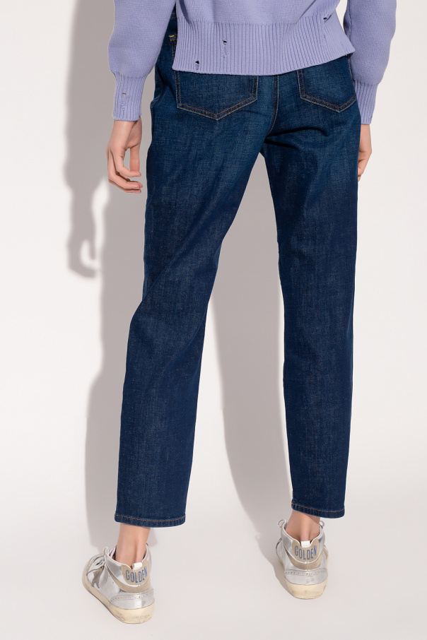 Dark blue \'2004\' jeans from Diesel. Falling with slightly tapered, cropped legs, this pair features a zip fly with a button, classic five pockets, a logo patch on the front and an embroidered red monogram at the back.