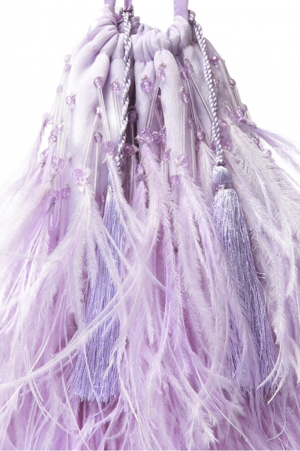 Light purple handbag from The Attico. Trimmed with silk. Drawstring fastening. Decorated with ostrich feathers and fringes. Embellished with decorative elements. One compartment inside.