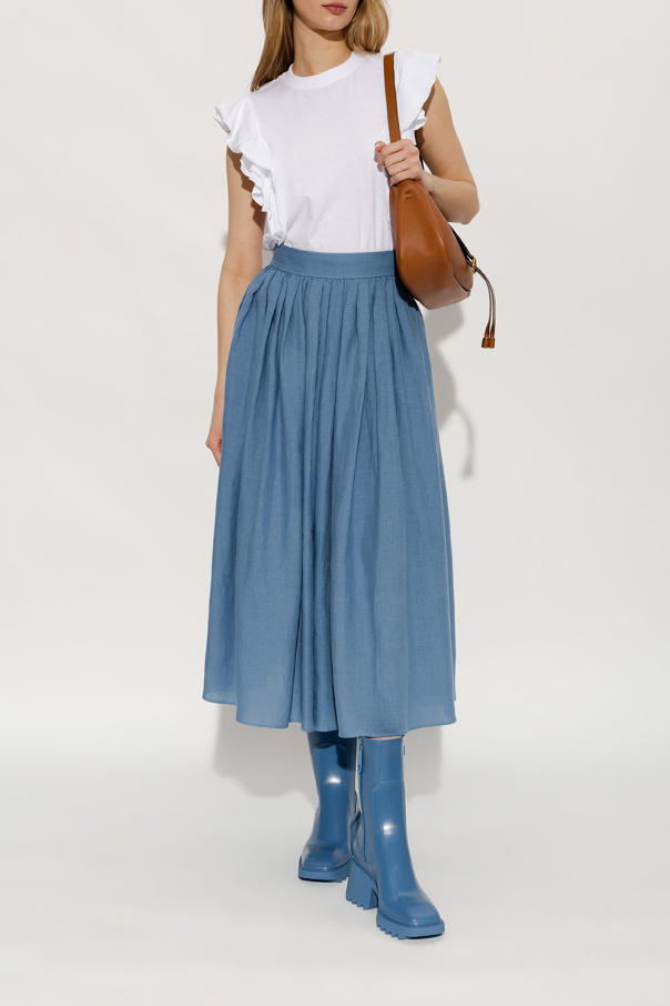 Blue ‘Betty’ heeled rain boots from Chloé. Made of rubber, this pair features a side zip, raised and printed logo, square, rounded toe, block heel and light beige rubber sole.
