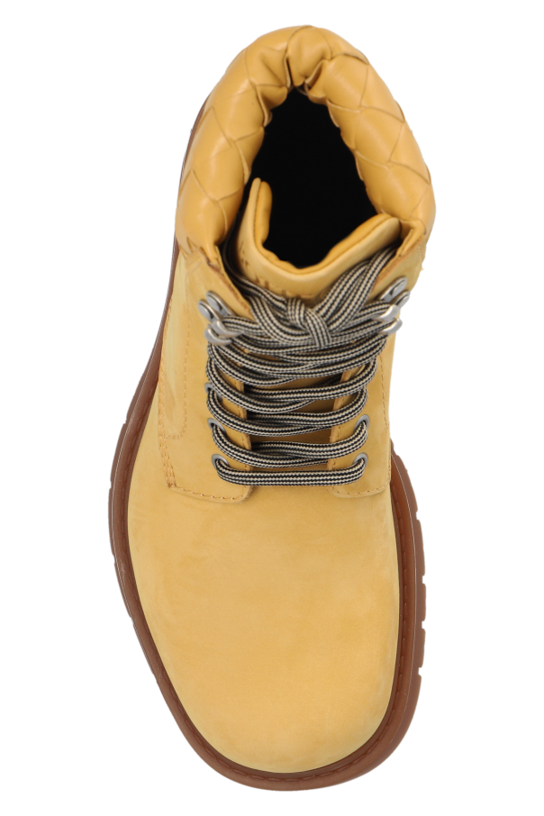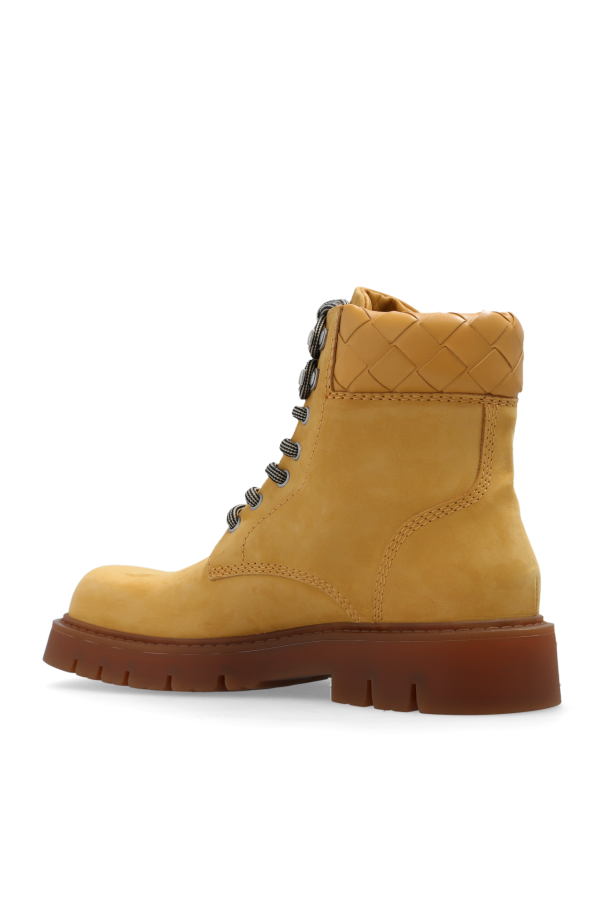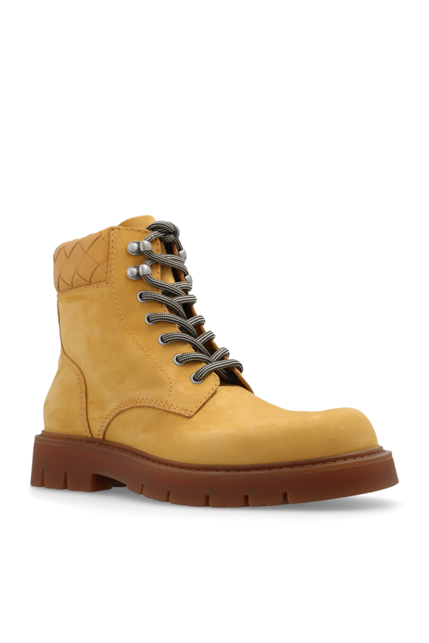 Beige ankle boots from Bottega Veneta. Made of nubuck, this lace-up model sits on a brown rubber sole and showcases the brand\'s signature Intrecciato weave on the collar.