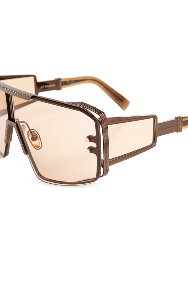 Introducing the exquisite \'Le Masque\' sunglasses by Balmain, a unisex accessory that transcends the ordinary with its audacious design and superior craftsmanship. With a dominant brown hue that elegantly graces the UV-protected, light-brown lenses and partially extends to the frames, these sunglasses are a testament to modern luxury and style. The futuristic, single-piece lens stretches across the entire width of the face, setting a bold statement. The frames, embellished with metallic elements, serve both aesthetic and structural purposes, showcasing Balmain\'s meticulous attention to detail. The side arms, possibly made of synthetic material or rubber, ensure enhanced wearing comfort, while the metal hinges and the designer\'s subtle logo on the temples or metal parts of the frames add a touch of exclusivity and recognition. Crafted from high-quality titanium, \'Le Masque\' stands out not only for its unique shape but also for its solid construction, promising durability and resilience. This avant-garde accessory is designed for those who dare to be bold, making a recognizable mark in the world of fashion. Why Purchase \'Le Masque\' Sunglasses? Exceptional unisex design that stands out in any accessory collection. Made from high-quality titanium, ensuring longevity and comfort. Features UV-protected lenses for eye safety under the sun. Boasts a futuristic and bold aesthetic, perfect for fashion-forward individuals. Includes subtle designer logos for an added touch of luxury and authenticity.