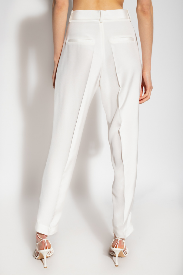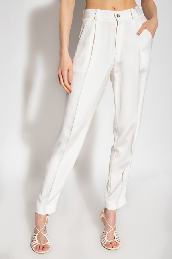 White ‘Caen’ trousers from The Mannei. Made of silk. Fastened with a zip and button, this pair features two front pockets, two back pockets and slightly tapered legs.