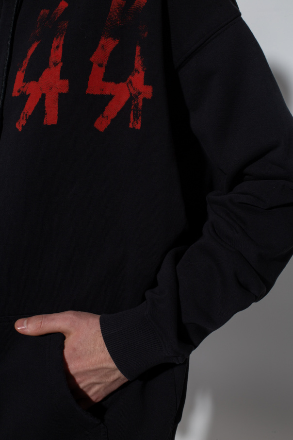 Black ‘44 Spine’ sweatshirt from 44 Label Group. Made of cotton, this garment features a zip fastening, drawstring hood, print and logo in red and cream.