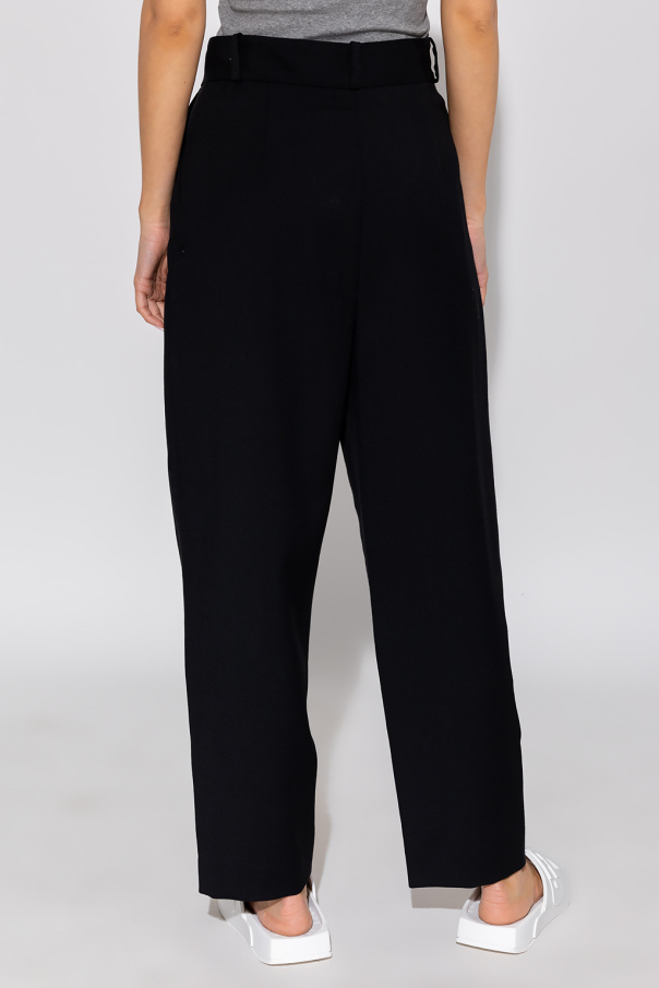 Black trousers from Toteme. Made of wool with a relaxed-fitting silhouette, this pair features a high-rise waist, a zip fly with a button and hook, pleat detailing, two front slip pockets and slightly tapered legs.