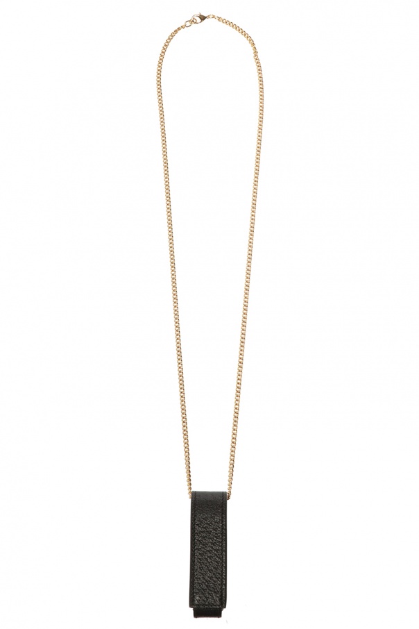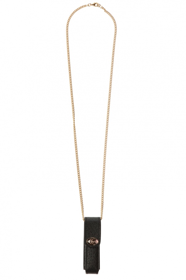 Black lipstick case on detachable chain strap from Gucci. Made of leather. Fastened via snap-button. Features gold-tone metal hardware including double G logo.