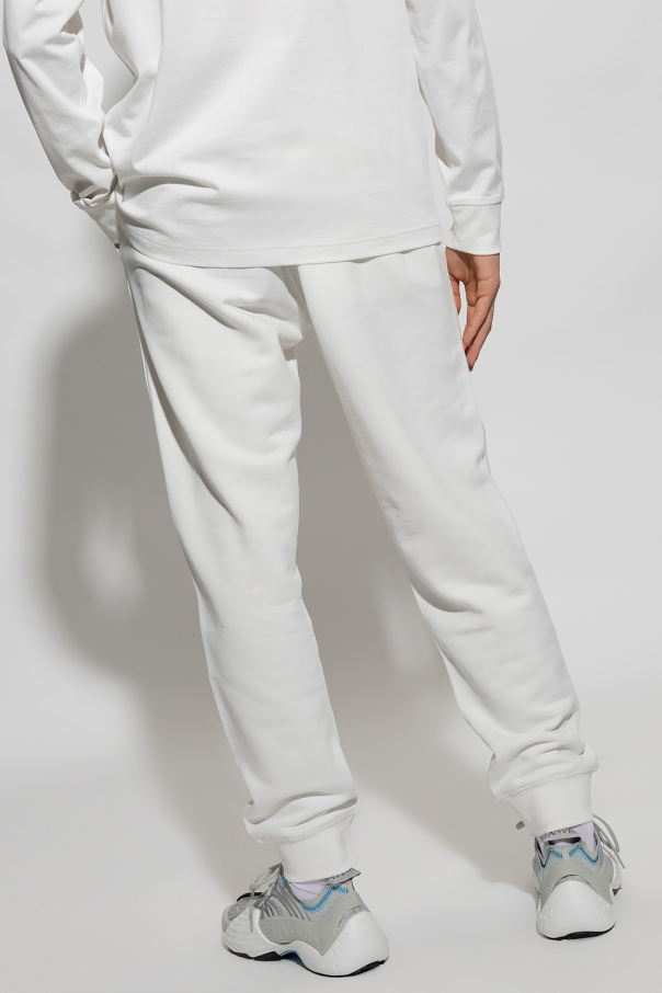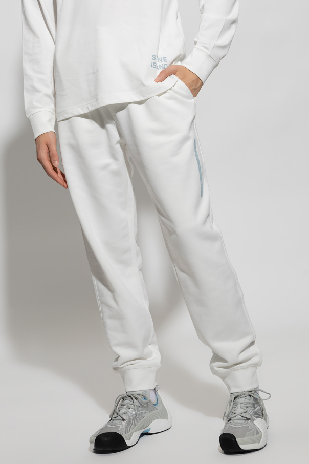 White sweatpants from Stone Island. Crafted from a cotton blend, this pair is complete with an elastic drawstring waistband, a grey logo print, two front pockets, one snap-fastened back pocket and ribbed cuffs.