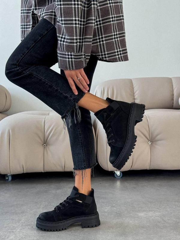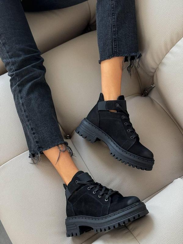 Женские ботинки деми черного цвета из натурального нубука. Подкладка байка.