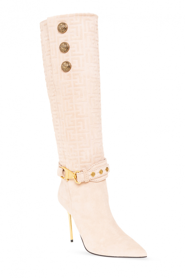 Beige ‘Robin’ heeled boots from Balmain. Made of calf suede with a monogram, this slip-on pair features a decorative appliqué, strap with a gold-tone logo-embossed buckle, pointed toe and black leather sole.