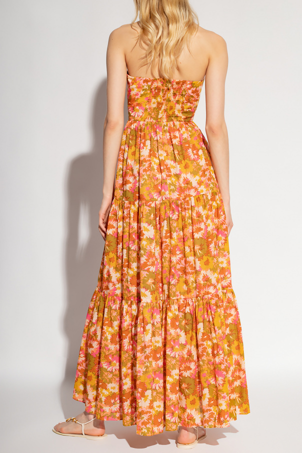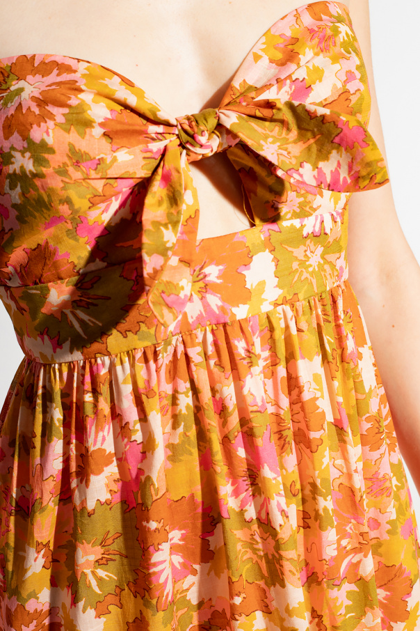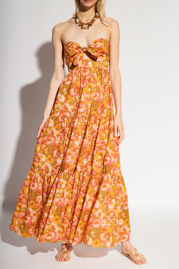 Long, multicolored sleeveless dress from Zimmermann. Crafted from cotton with a floral motif, this design features a fitted top with a concealed zip and hook, elasticated panel at the back, boning on the sides, decorative ties, cut-out and wide skirt with ruffles.