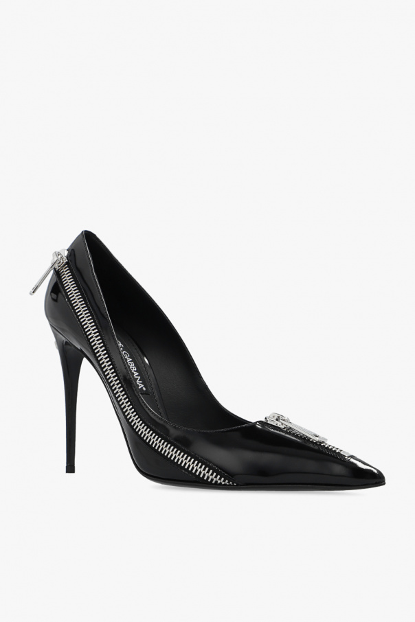 Black ‘Lollo’ stiletto pumps from Dolce & Gabbana. Crafted from patent calf leather, this model features a pointed toe silhouette with decorative silver-tone zippers, a black leather sole and a logo plaque on the heel.