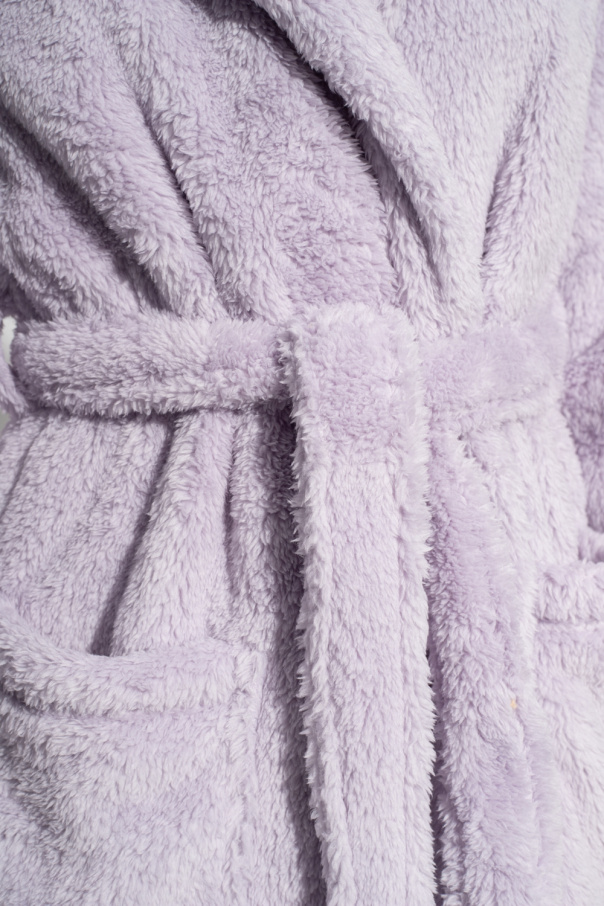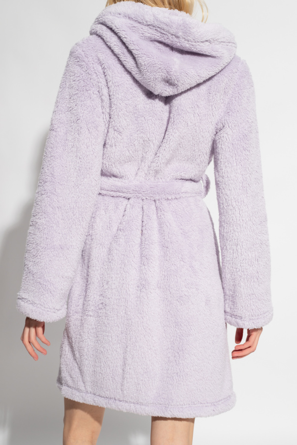 Light purple ‘Aarti’ bathrobe with a hood from UGG. Made of plush sherpa, this style is cinched with a tie belt at the waist and features long sleeves and two frontal pockets – one is embroidered with a tonal logo.