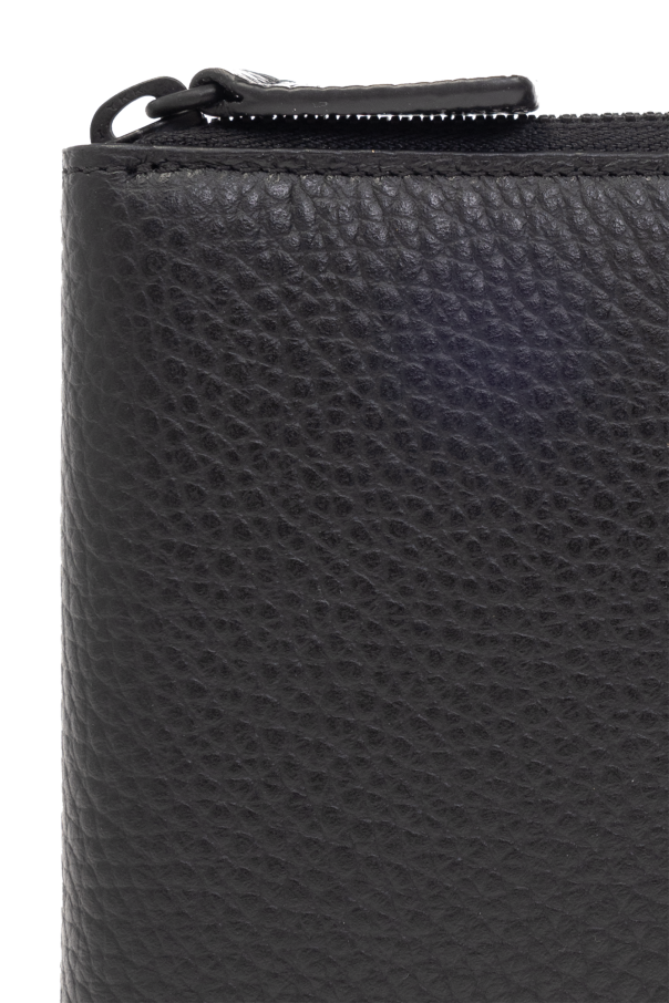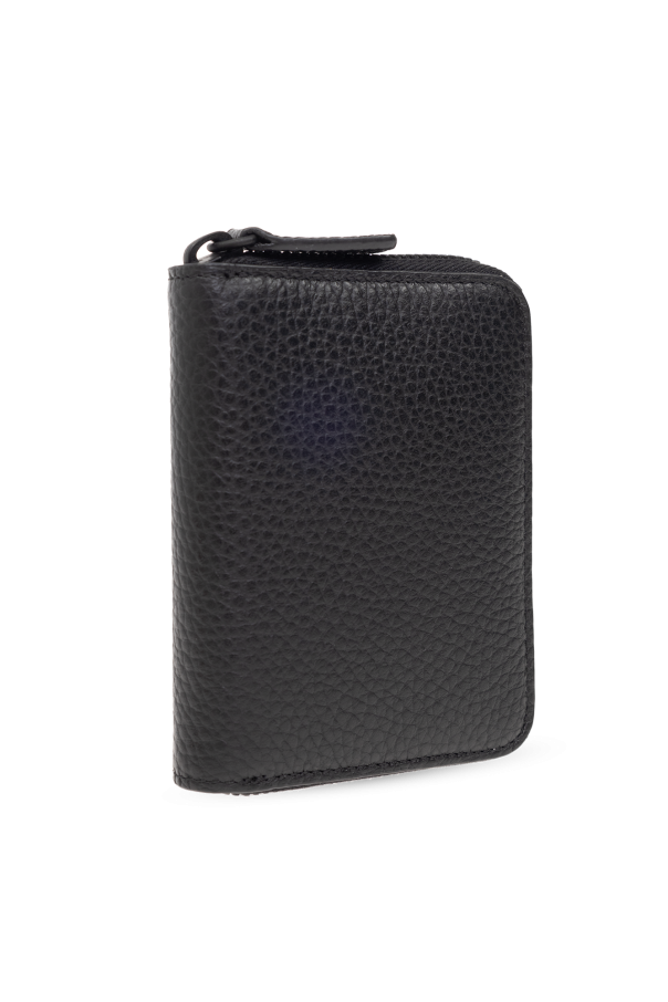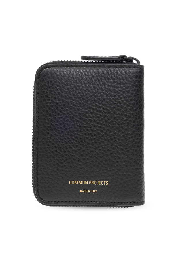 Black wallet from Common Projects. Crafted from grained leather, this item fastens with a zip and is decorated with a gold-tone logo print. It has a zipped coin pocket and six card slots inside.