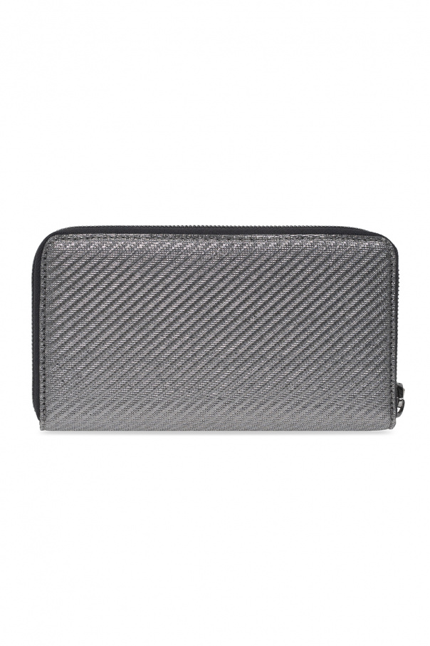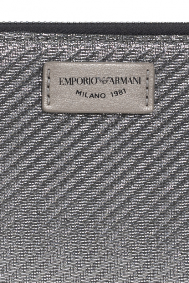 Silver-tone wallet from Emporio Armani. Fastened with a zip, this model features a logo patch and silver-tone metal hardware. It has two internal compartments with twelve card slots, one zip pocket and one slip pocket.